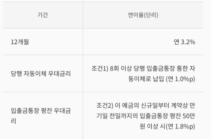 우대조건이 까다롭지 않아 쉽게 적용받으실수 있어 편리합니다 단 최대로 저축하실 수 있는 금액이 30만 원으로 1년 동안 많은 금액을 저축하시기 어렵다는 단점이 있습니다.