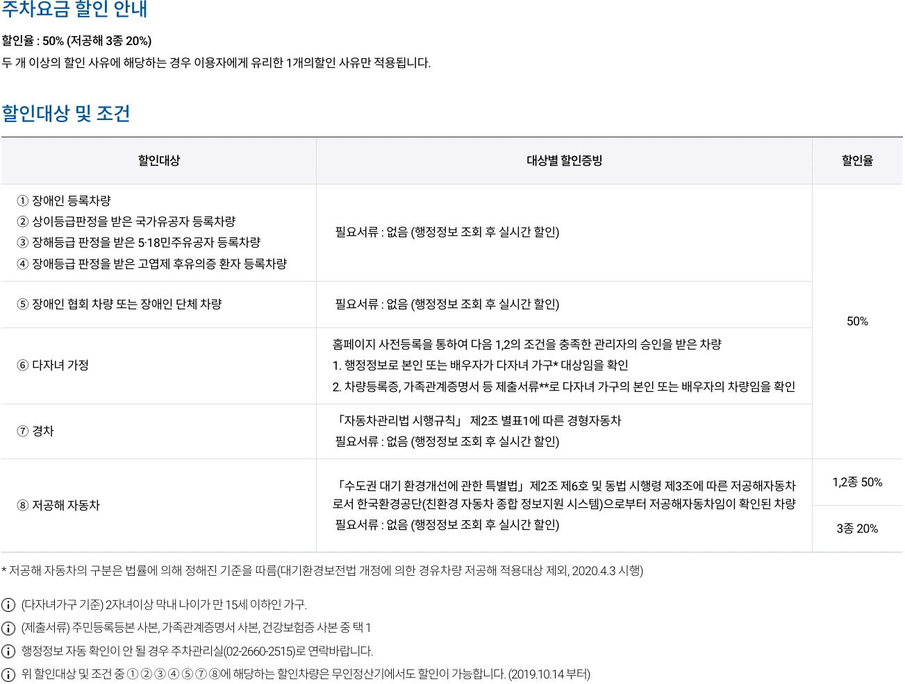 할인 대상자 중에 가장 잘못 알려진 것이 경유차 할인입니다 경유차 할인은 2020년 4월 3일부로 지원이 끝났으며 할인 없는 요금을 지불하셔야 합니다 주차비를 아낄 수 있는 대상자는 다음과 같습니다