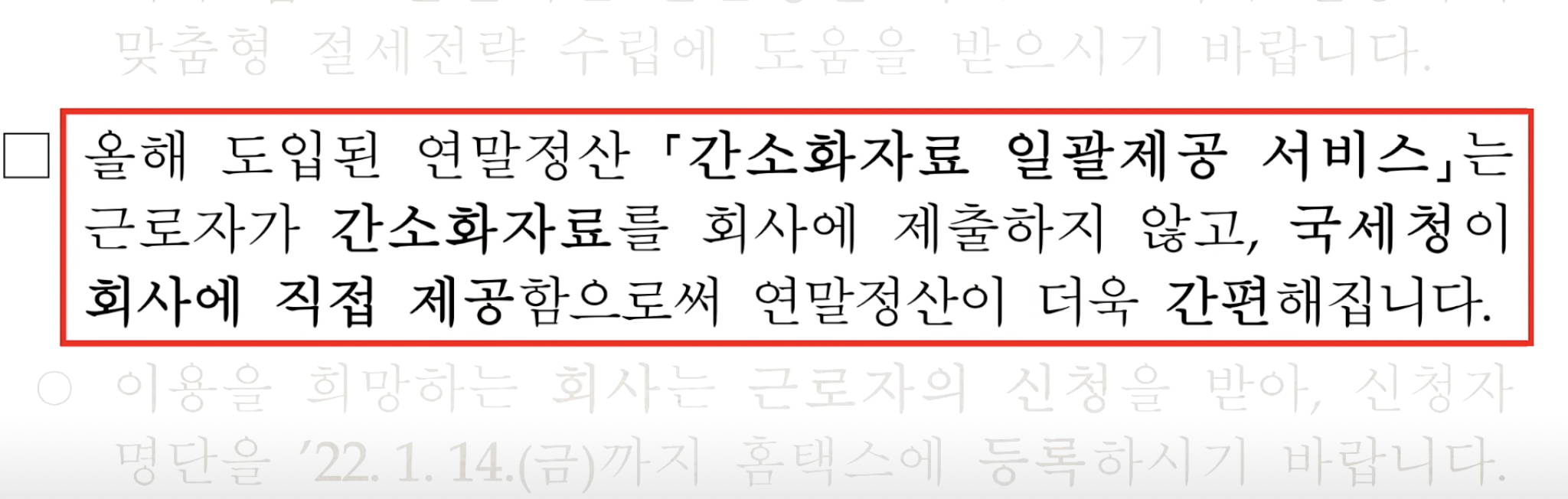 올해부터 일괄제공서비스가 시작됩니다 기간은 22.1.14까지 이고 사전에 신청만 하면 자료를 회사에 따로 제출하지 않으셔도 되고 국세청에서 회사로 직접 자료를 제공해서 훨씬더 편리해 졌습니다