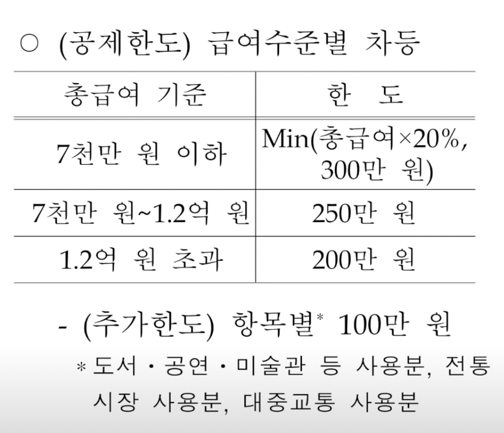 2.작년보다 소비한 금액이 5%이상 초과했다면 초과한 금액의 10%까지 추가로 공제가 됩니다 단 신용카드 사용금액이 총급여에 20프가 넘어야 됩니다 연소득이 7천만원 이하라면 신용카드 체크카드 현금영수증 전통시장 대중교통비가 포함되고 도서 미술관 공연까지 포함됩니다
