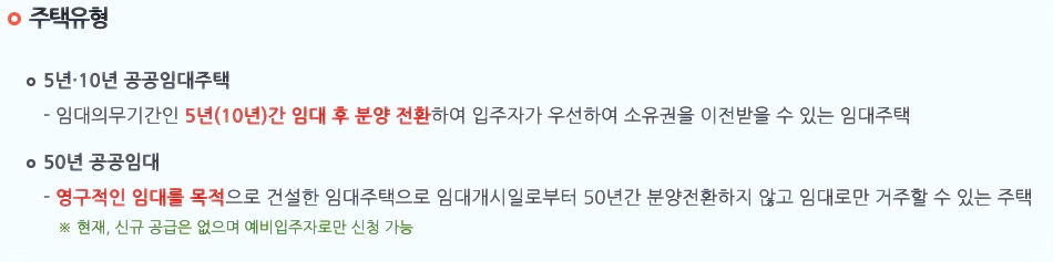 영구적인 임대를 목적으로 한 주택을 말하는데 임대 시작일부터 50년간 분양으로 전환하지 않고 임대 형태로만 거주할 수 있습니다 현재 신규 공급 예정은 없으며 예비입주자로 신청까지만 가능합니다.