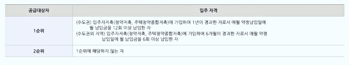공고일 기준 6개월 이상 납입이 유지되고 확인된 사람 기준으로 철거민, 공무원, 장애인, 군인, 중소기업 근로자, 한부모가족 등이 해당된다.